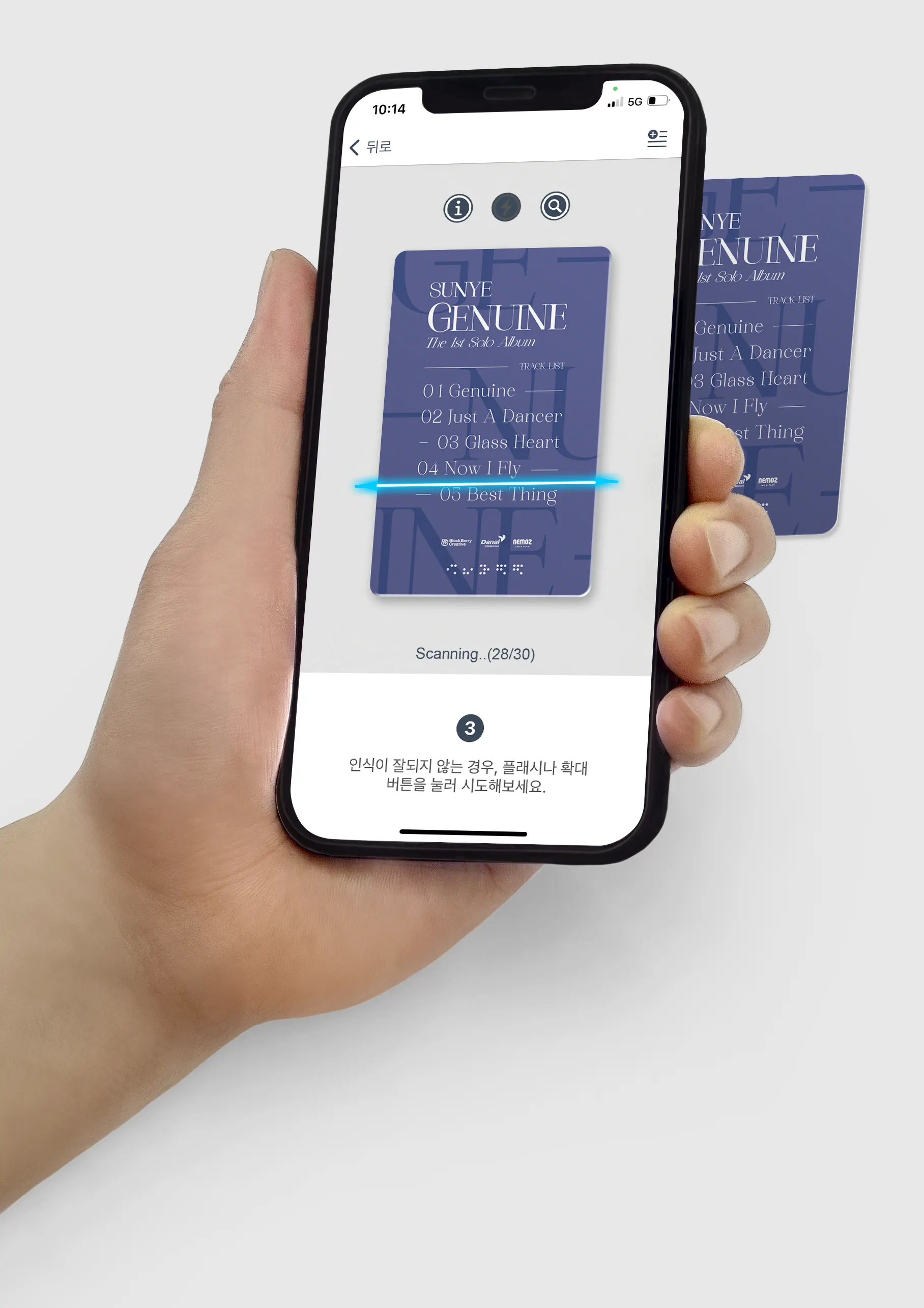 QR类型 : 通过Nemoz应用软件内的相机扫描卡背面的二维码进行认证。安装Nemoz应用软件,登录后点击应用软件上方的"+",点击"QR"扫描Nemo卡背面的二维码,就可以对专辑进行正版认证,并登录到账号。